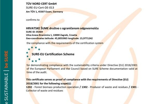 Nakon uspješno odrađenog recertifikacijskog audita, Hrvatskom šumama d.o.o. dodijeljen je novi SURE CERTIFIKAT s rokom važenja od 13. 12. 2024. do 12. 12. 2025. Podsjetimo,